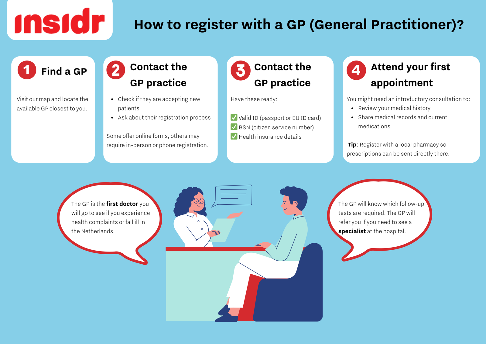 Your general practitioner (huisarts) is your first point of contact for all non-emergency medical concerns. They:
